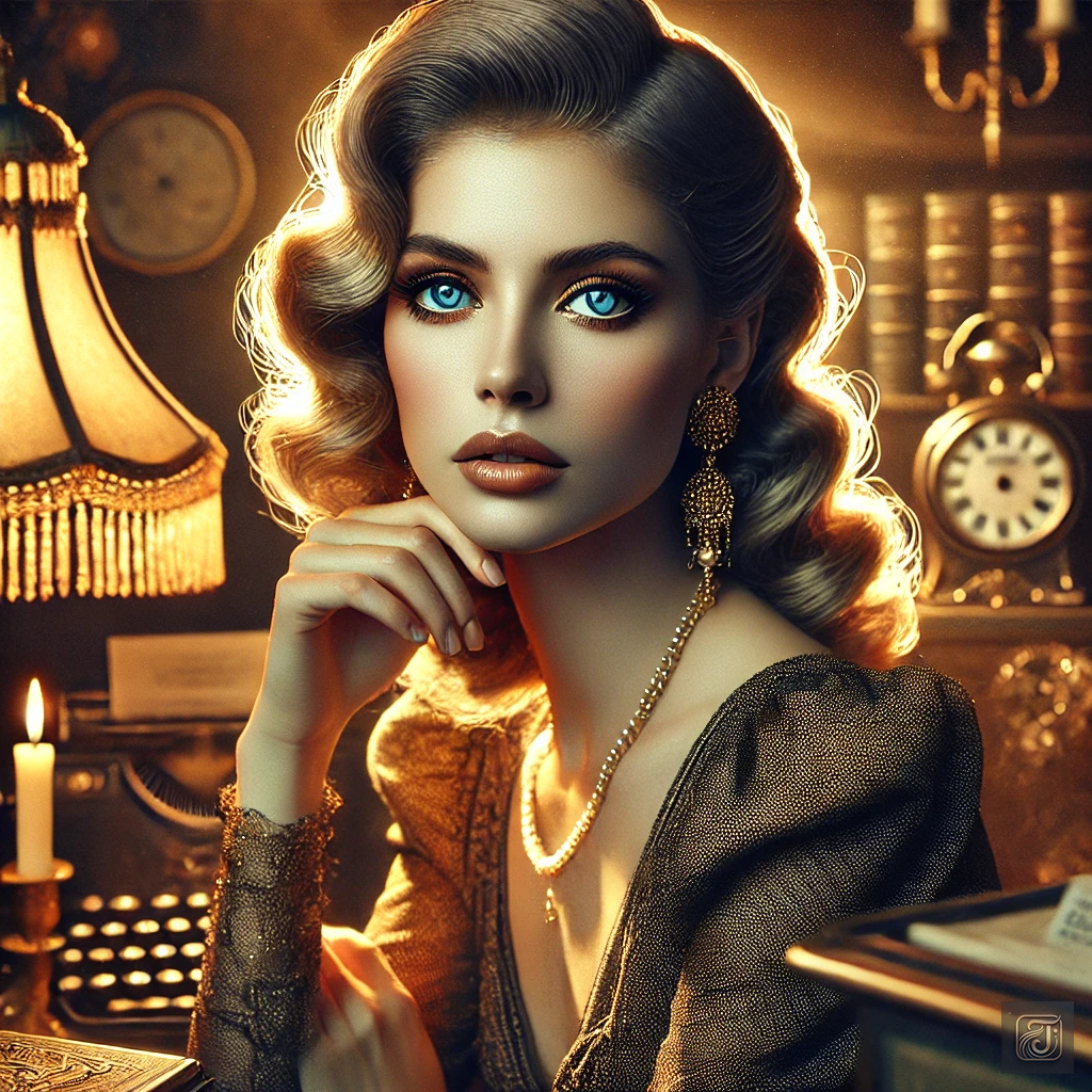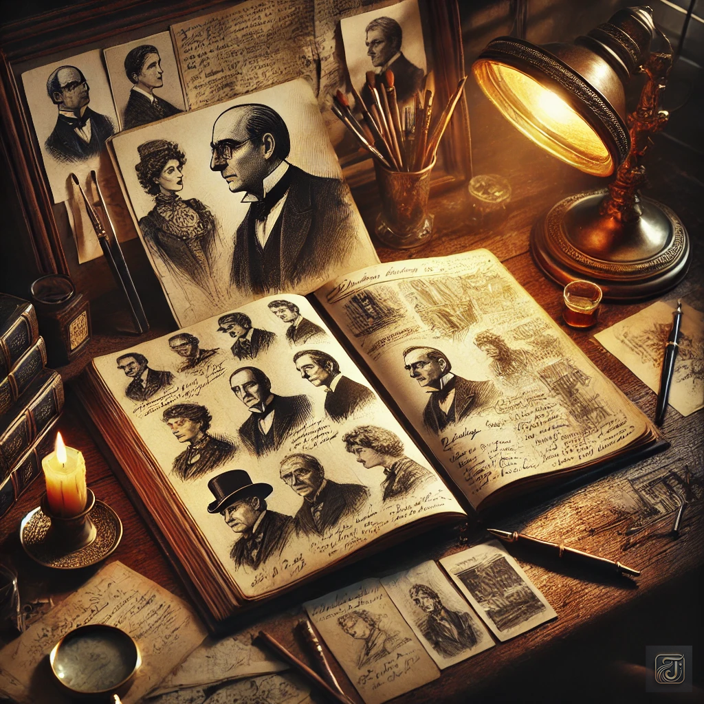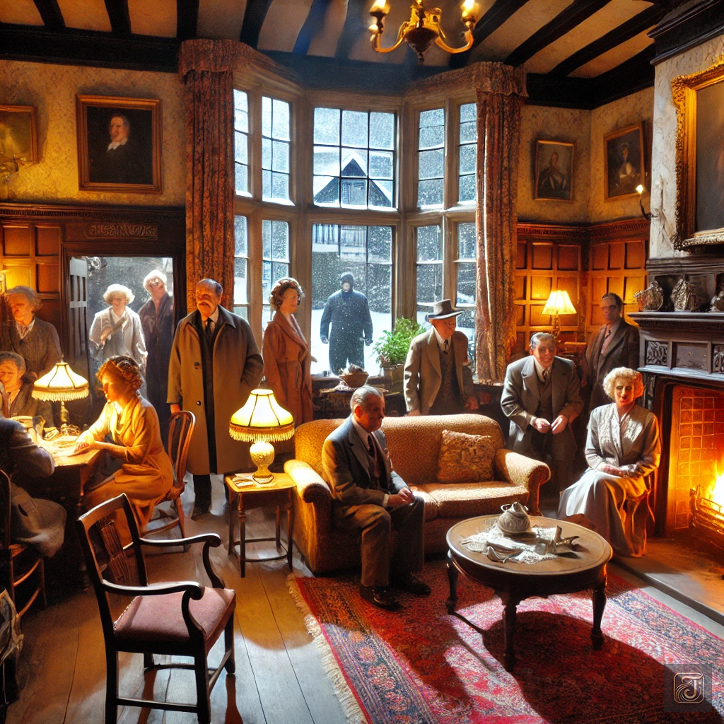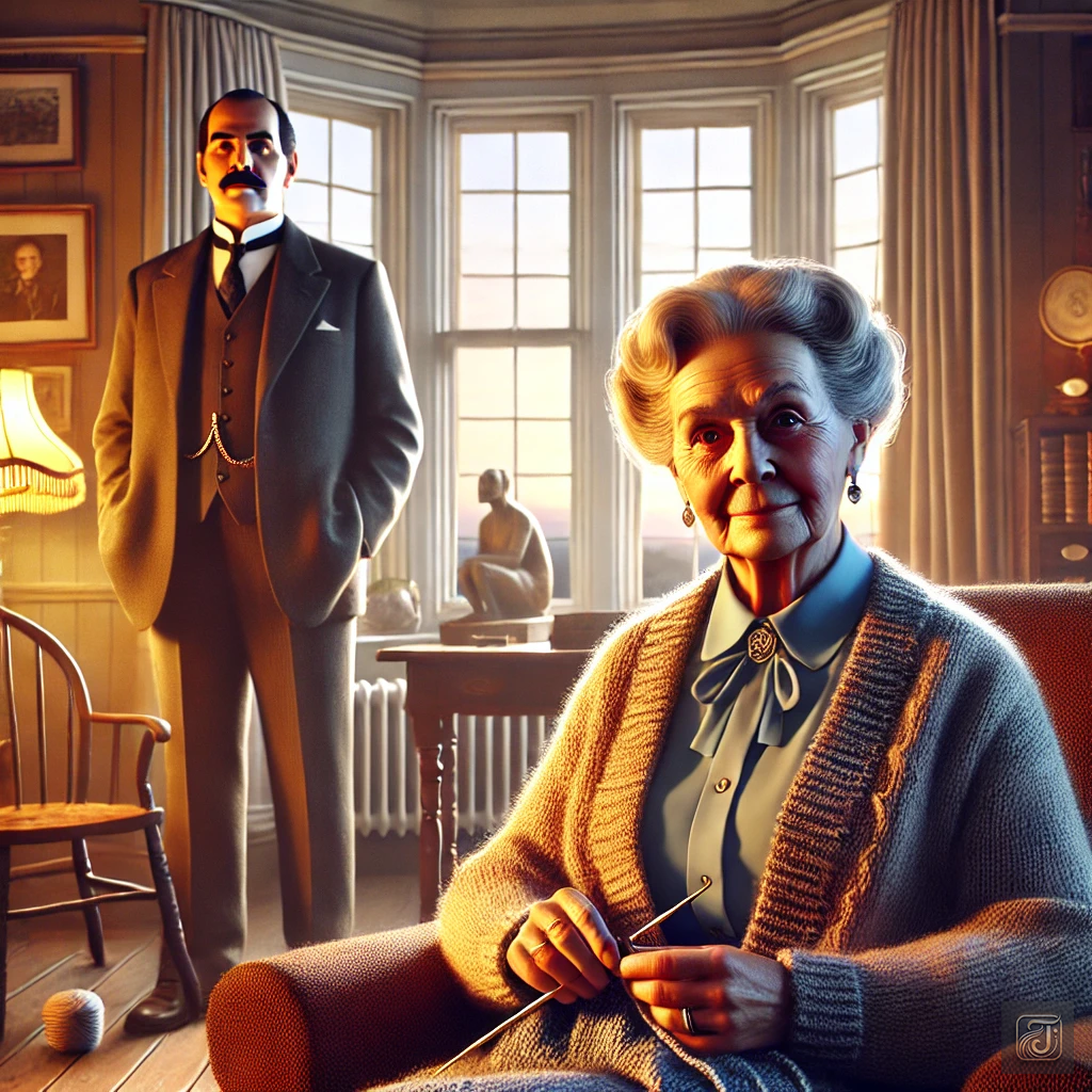 Among them are the early prototypes of characters who would later become the famous detectives Poirot and Marple, standing silently, their forms not yet fully defined.