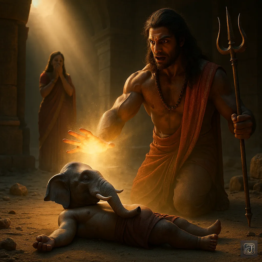 Realizing this, Shiva became anxious and hurried to search for the head.