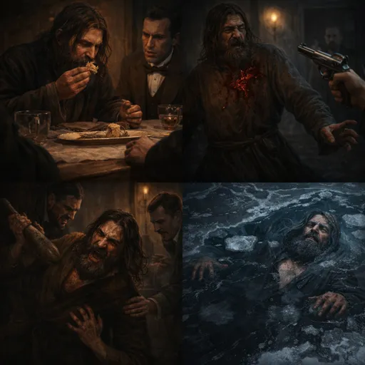 and in the end, he was poisoned, beaten, shot, and finally cast into the frozen river.