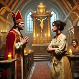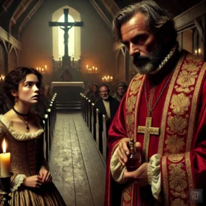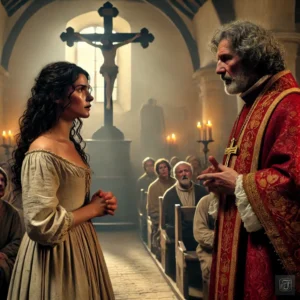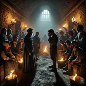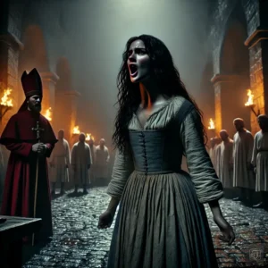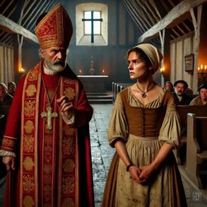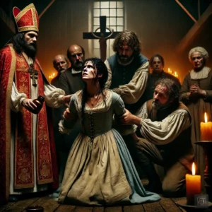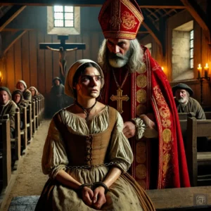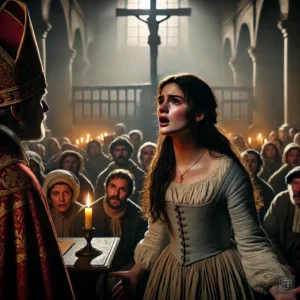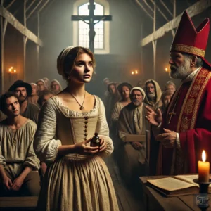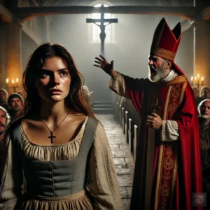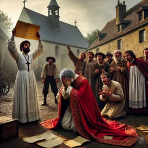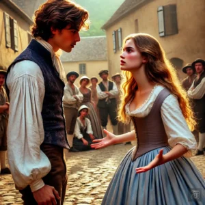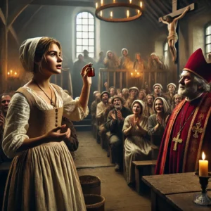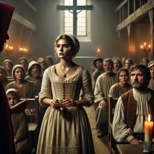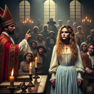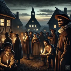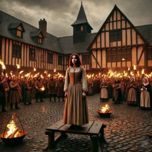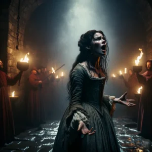 Amidst the flickering candlelight, Adèle stood in the center, surrounded by murmuring villagers whose voices were filled with suspicion directed at her.