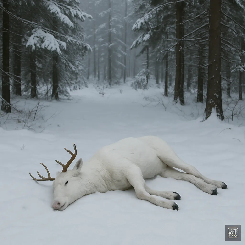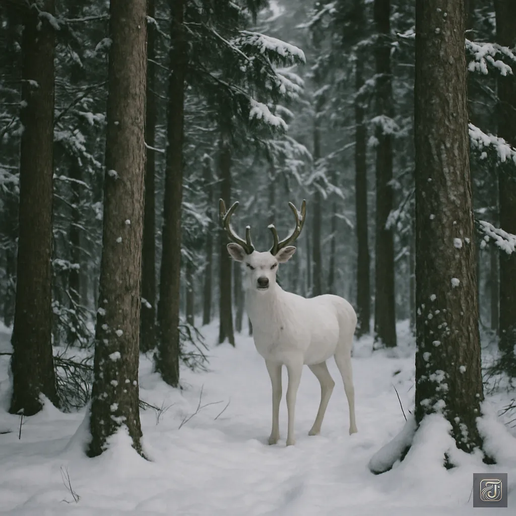 Between the trees, a white silhouette—a deer.