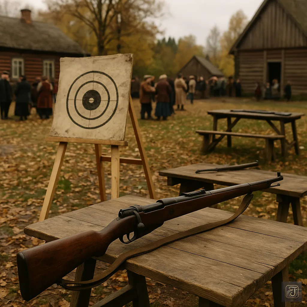 In the town square, handmade targets and rifles were lined up.