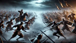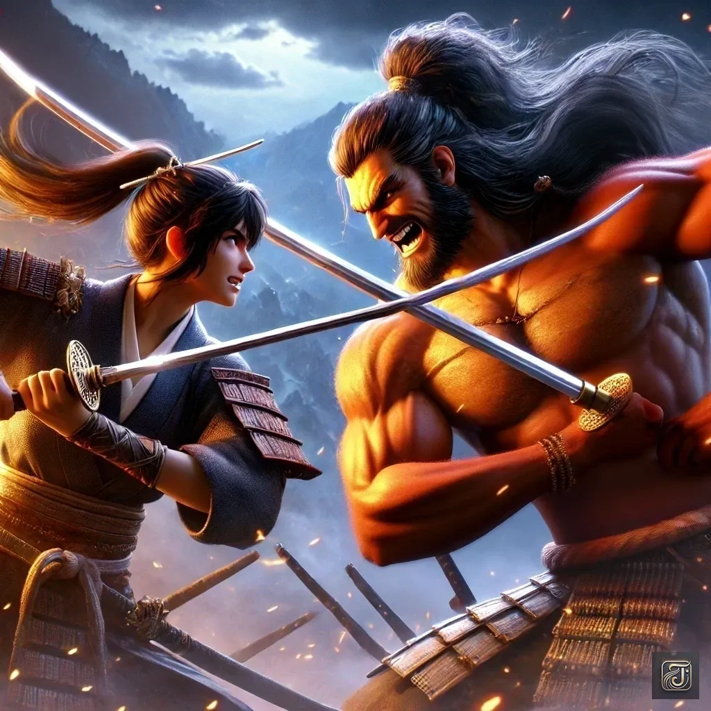 The two clashed fiercely with their swords, and in a flash, Tomoe Gozen exploited a gap in Morishige’s defense, overpowering him with swift and forceful moves.