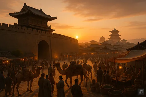 From beyond the grand walls glowing in the setting sun, the scent of tea mingled with the bustle of the crowds, making the city appear like a dreamlike metropolis.