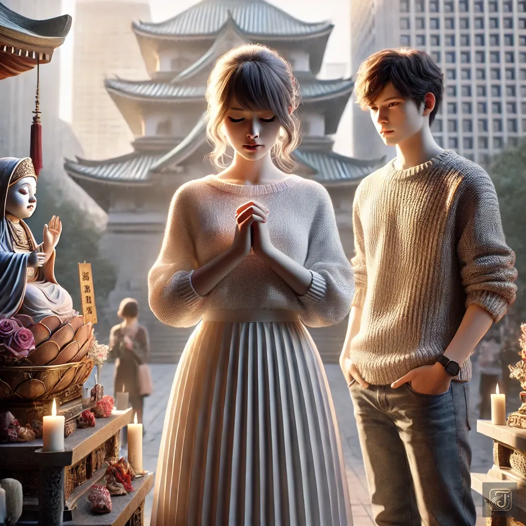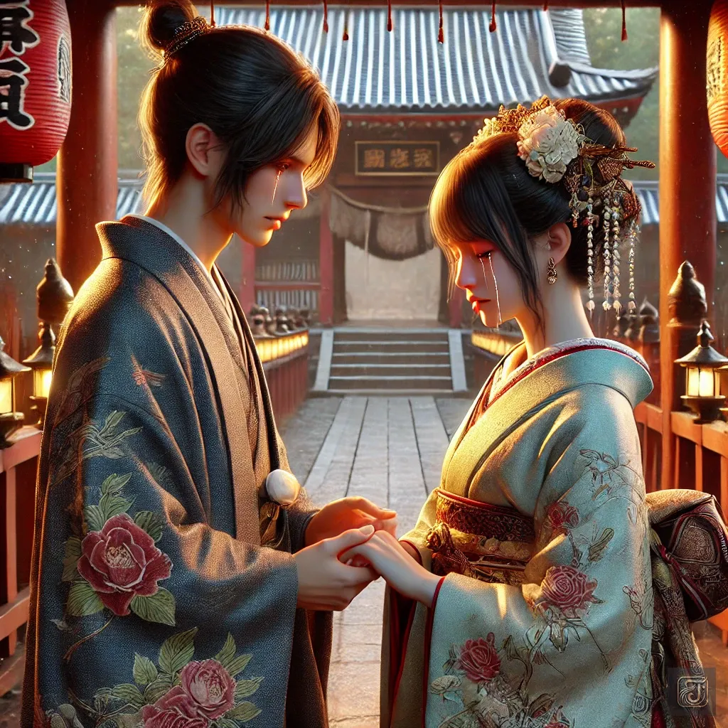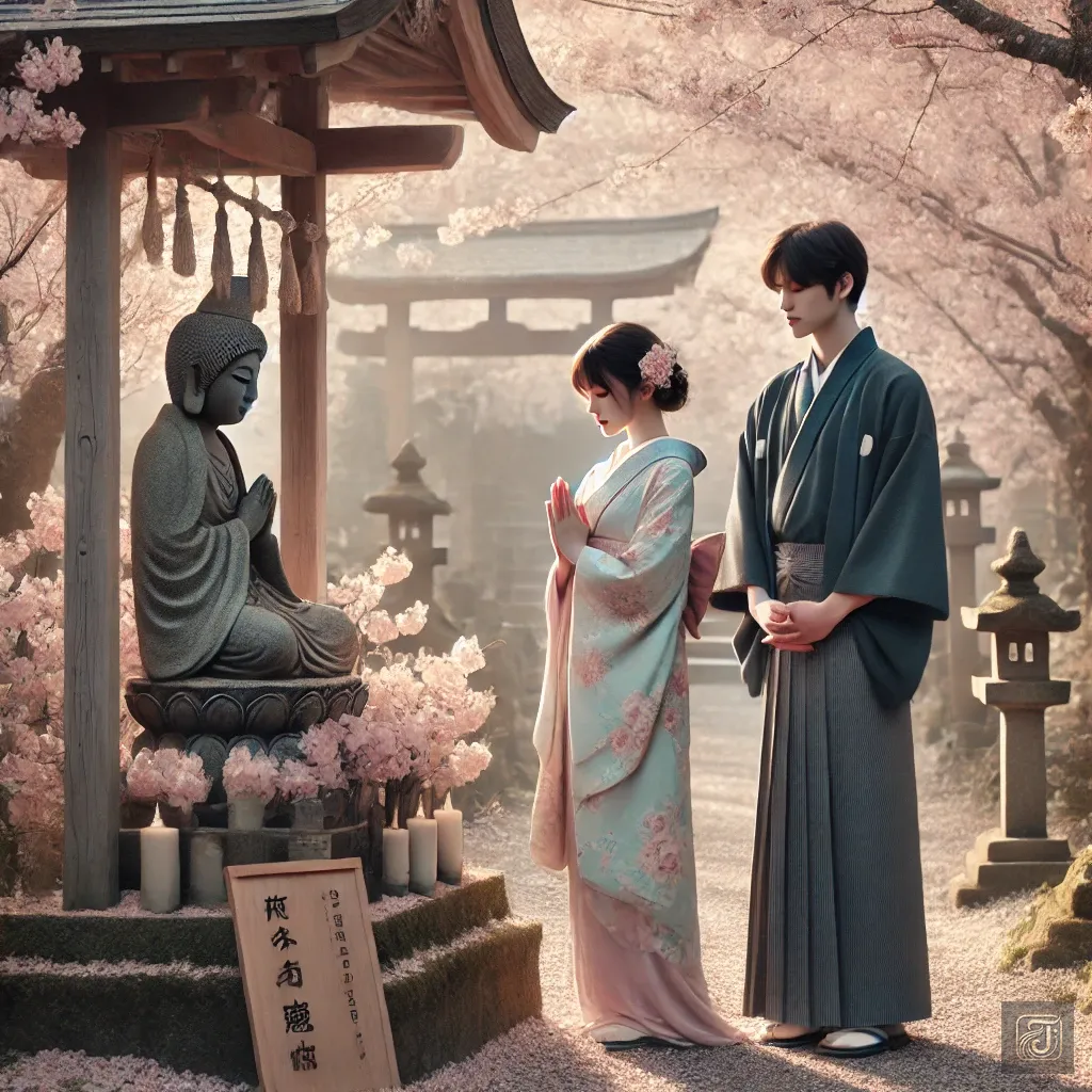 The Jizo statue quietly listened to their words, as if watching over a love that transcended time.
