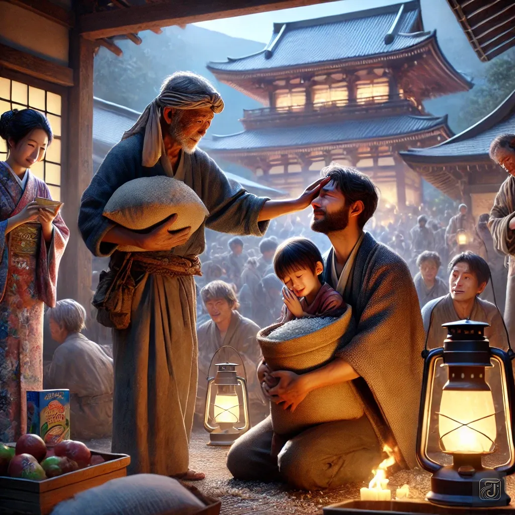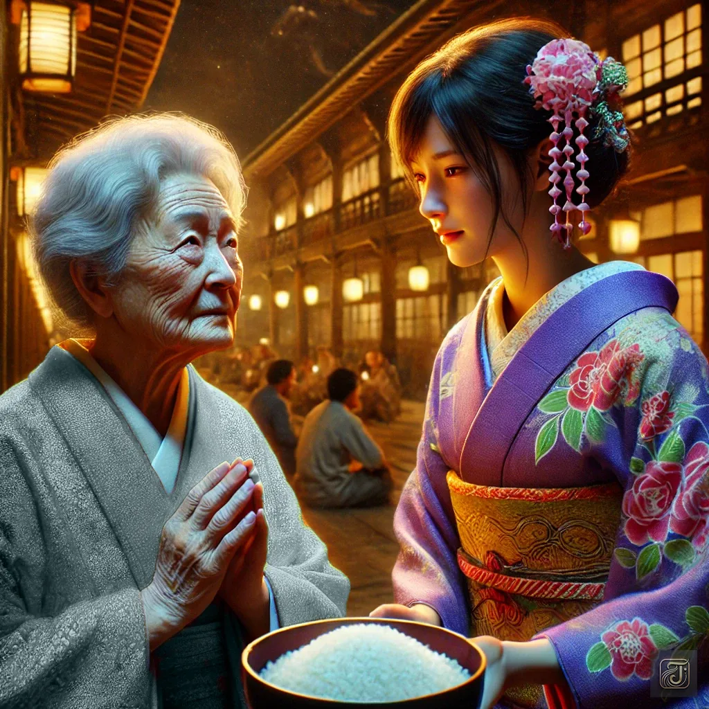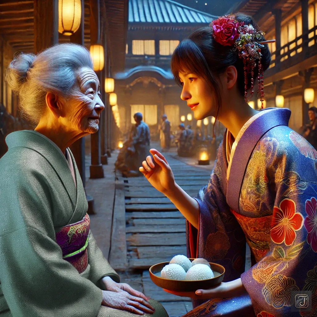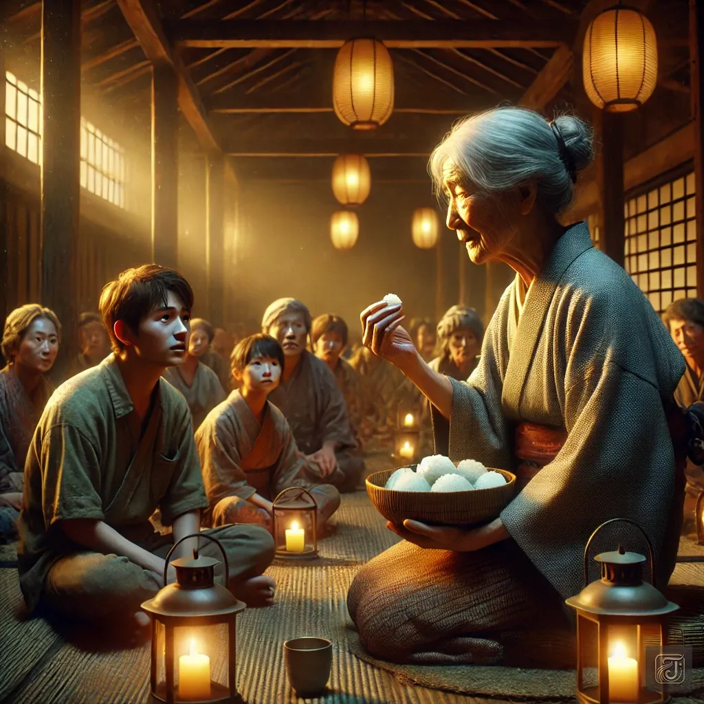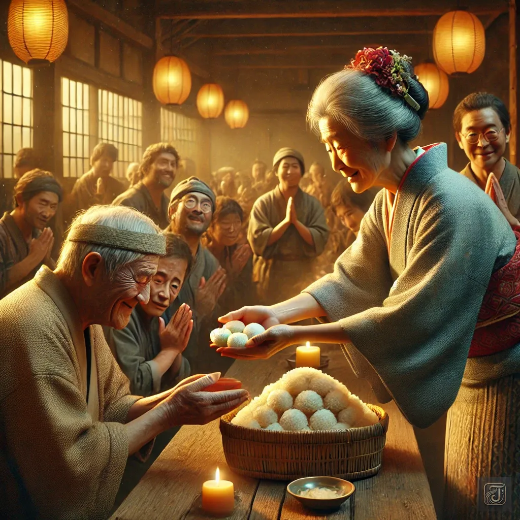 One day, an elderly woman appeared, carrying rice balls in her hands.