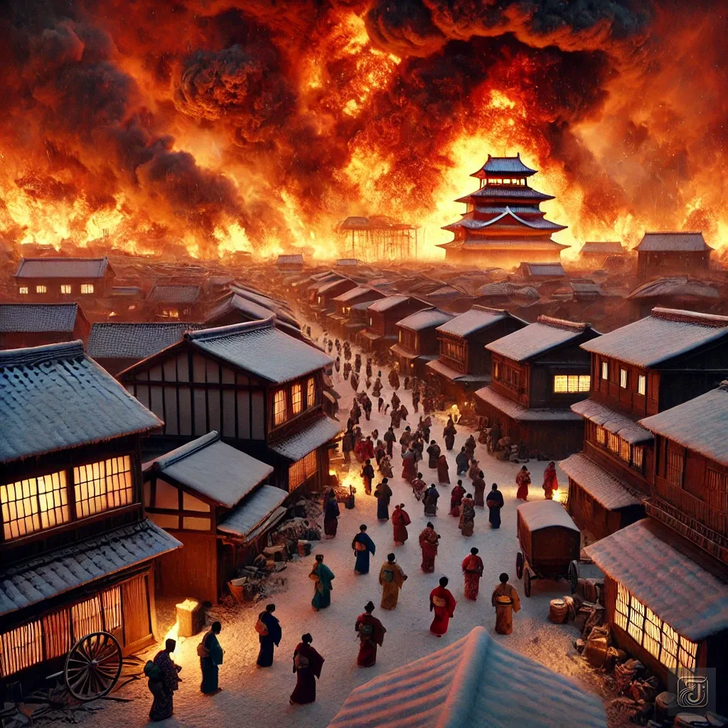 On December 28th of that year, a great fire engulfed the city, painting the Edo capital sky a vivid crimson.