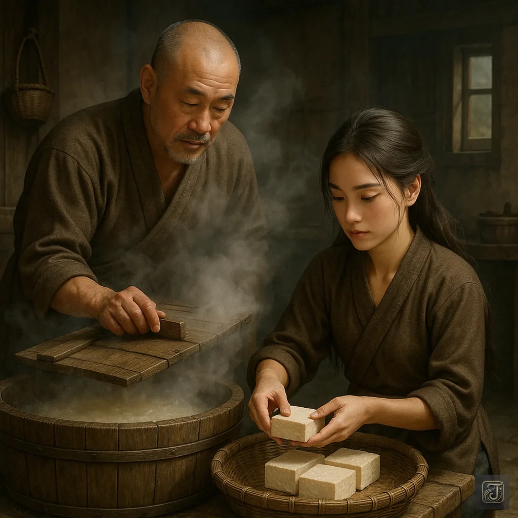 The young girl, Wing Chun, carefully scooped up blocks of tofu with her small hands and placed them neatly into a basket.