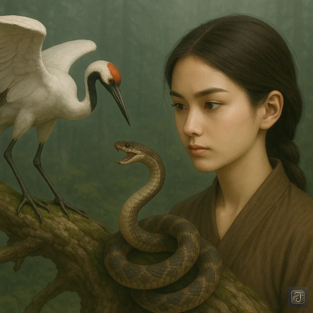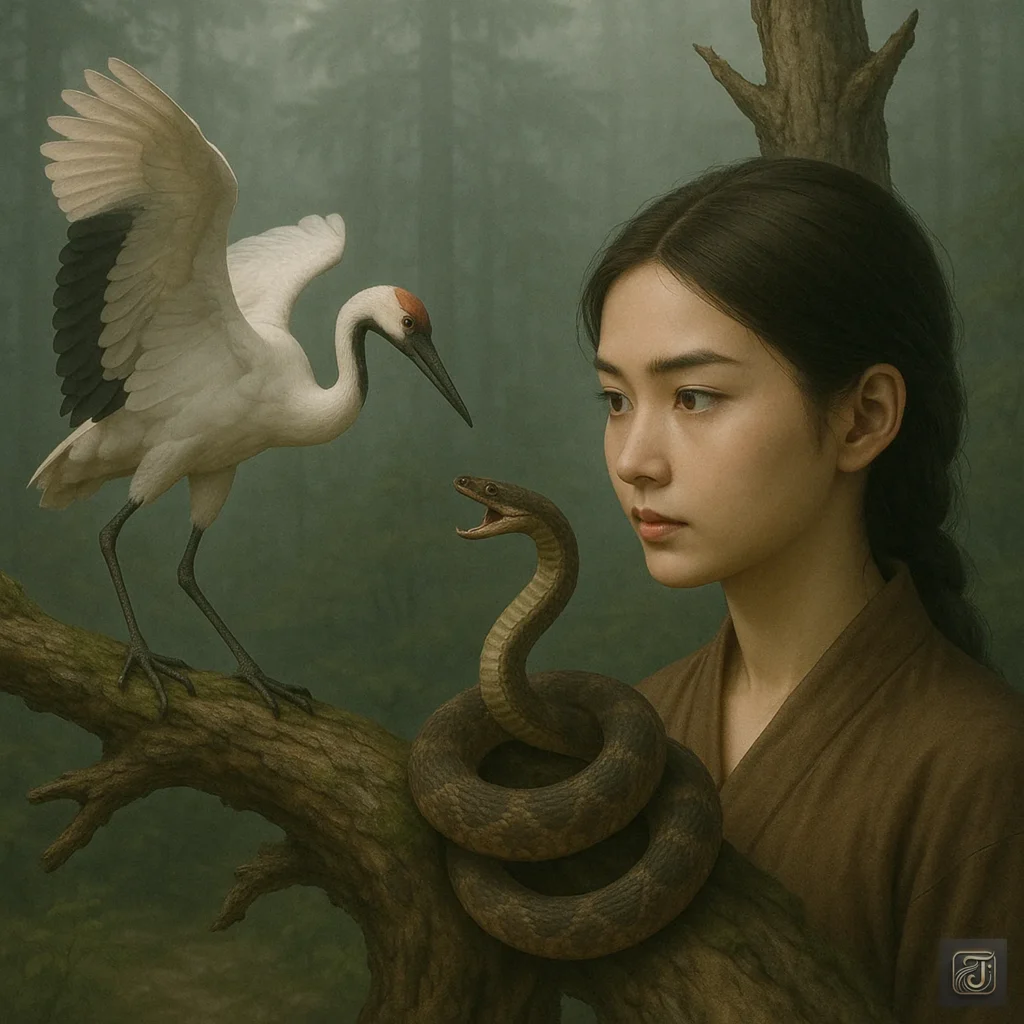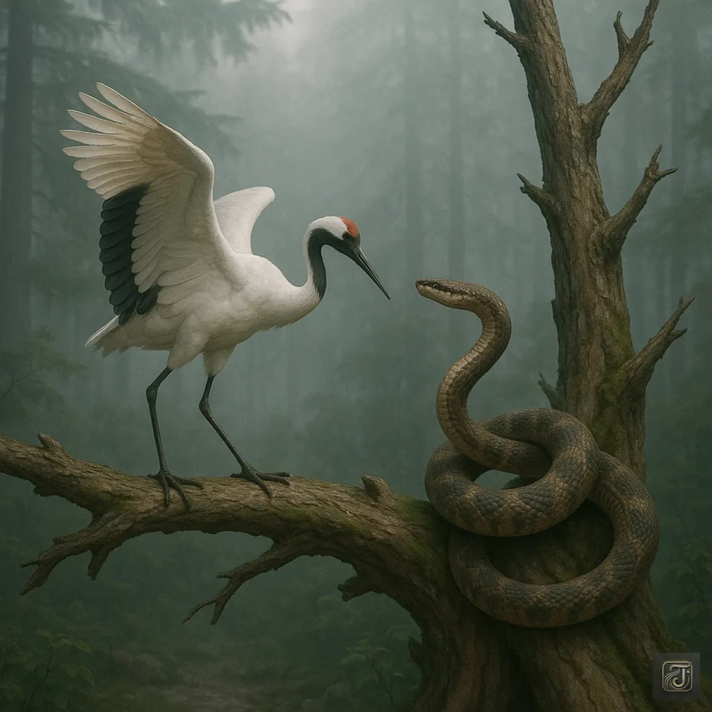 Atop a withered tree, a crane stood face-to-face with a serpent.
